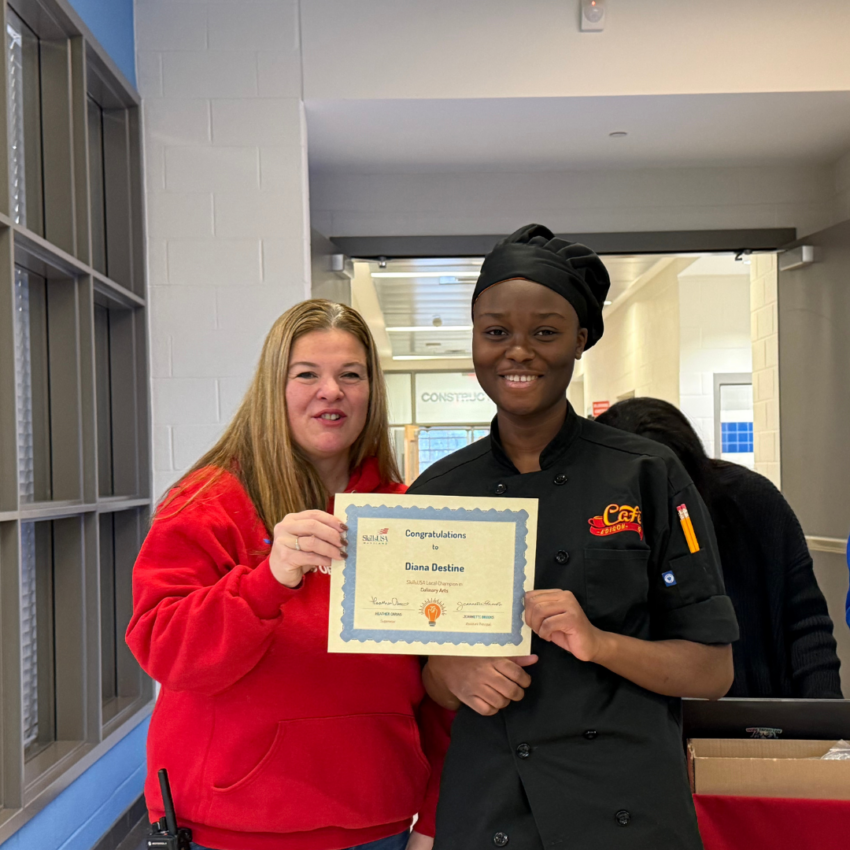 During the week of Dec. 8, students demonstrated their knowledge, skills and growth by competing in one of 43 local SkillsUSA competitions held at Thomas Edison High School of Technology. The event recognized 127 students who earned top scores in their respective competitions and advanced to regional and/or state levels. Each of these students was celebrated in front of their peers and received a certificate and pin, designed by senior graphic design student Ivan Gajduko.