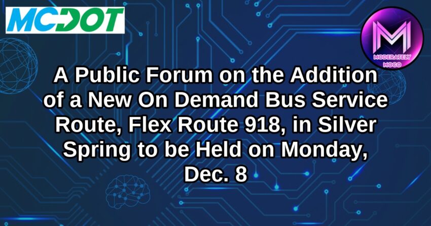 The Montgomery County Department of Transportation (MCDOT) is hosting a public forum at 6:30 p.m. on Monday, Dec. 8 at White Oak Middle School, 12201 New Hampshire Avenue, Silver Spring, MD 20904. At the meeting, MCDOT will be proposing the introduction of a new on-demand service route, Ride On Flex Route 918, and collecting public feedback and answering questions.