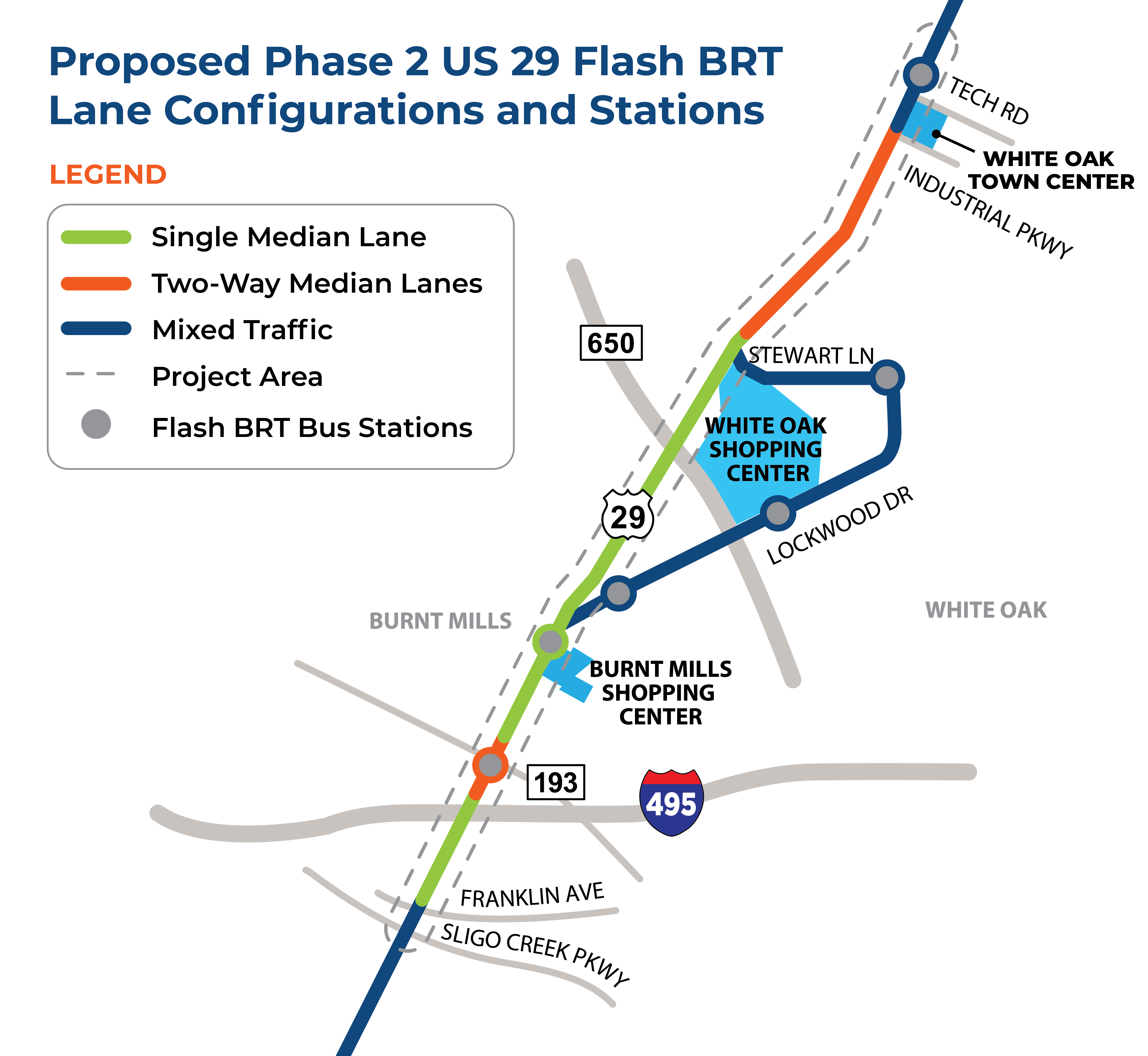 The US 29 Flash BRT has been in operation since October 2020 between Downtown Silver Spring and Briggs Chaney, with weekday rush hour service to Burtonsville. The improvements are part of a “Phase II” to improve travel time and service reliability. Improvements include the addition of dedicated bus lanes, bus priority at traffic signals, and safety enhancements for pedestrian and bicycle connections.