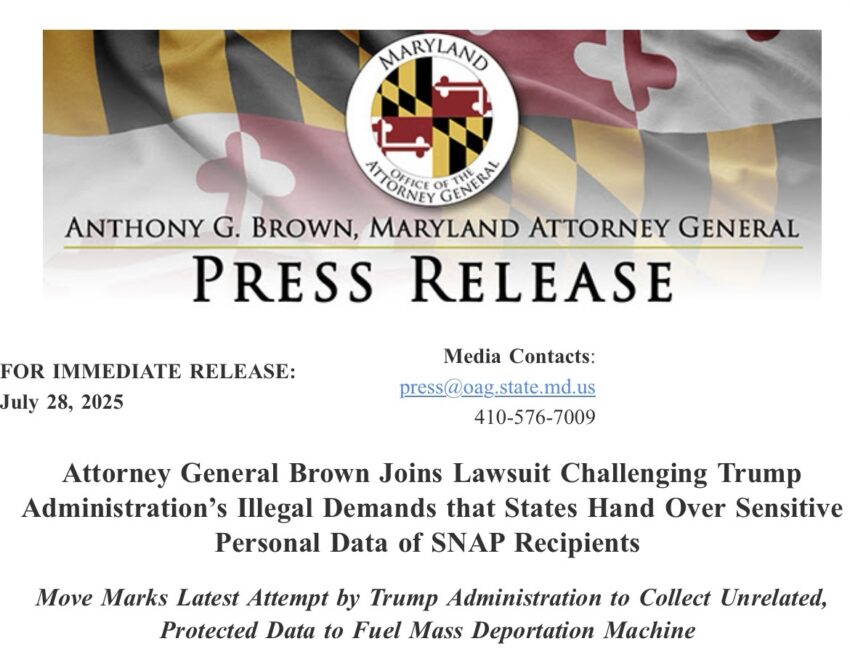 SNAP applicants provide their private information on the understanding, backed by long-standing state and federal laws, that their information will not be used for unrelated purposes. USDA has suggested that it could withhold administrative funding for the program if states fail to comply – effectively forcing states to choose between protecting their residents’ privacy and providing critical nutrition assistance to those in need. Maryland receives roughly $1.7 billion per year for the program, and any delay in that funding could be catastrophic for the state and the residents who rely on SNAP to put food on the table. In a lawsuit filed today in the Northern District of California, Attorney General Brown and the coalition argue that this demand violates multiple federal privacy laws and the U.S. Constitution.