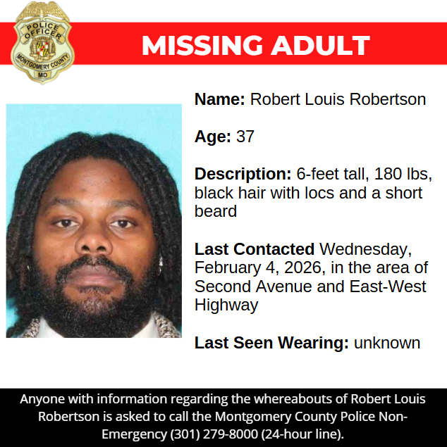 Gaithersburg, MD – Detectives from the Montgomery County Department of Police – 2nd District Investigative Section are asking for the public’s assistance in locating Robert Louis Robertson, a missing 37-year-old.