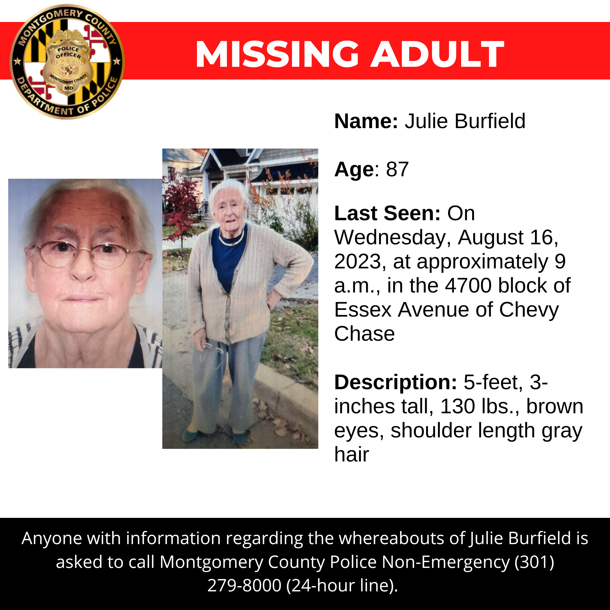 Gaithersburg, MD – Detectives from the Montgomery County Department of Police – 2nd District Investigative Section are asking for the public’s assistance in locating Julie Burfield, a missing 87-year-old.