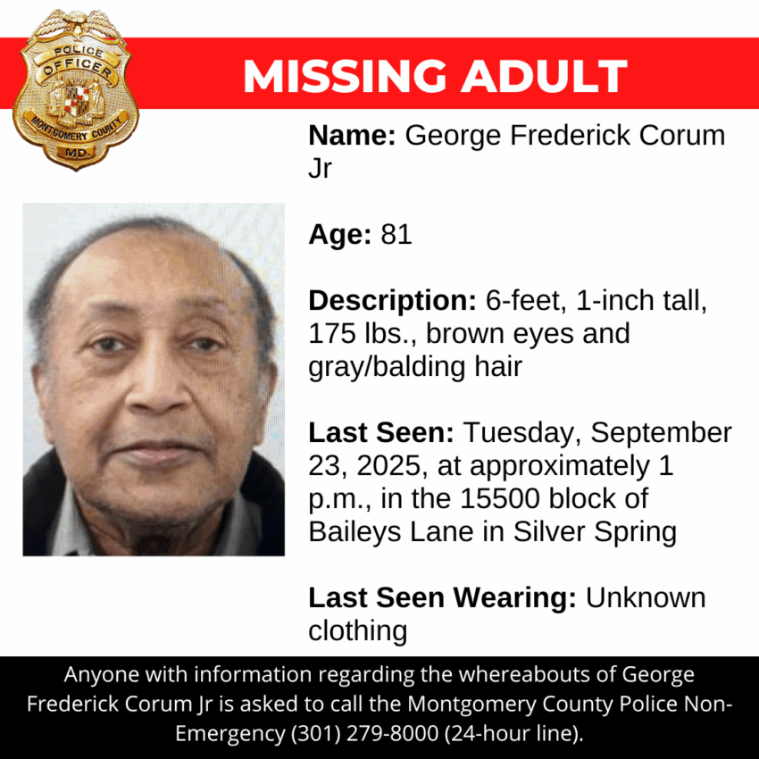 Gaithersburg, MDÂ –Â Detectives from the Montgomery County Department of Police – 4th District Investigative Section are asking for the public’s assistance in locating George Frederick Corum Jr, a missing 81-year-old.