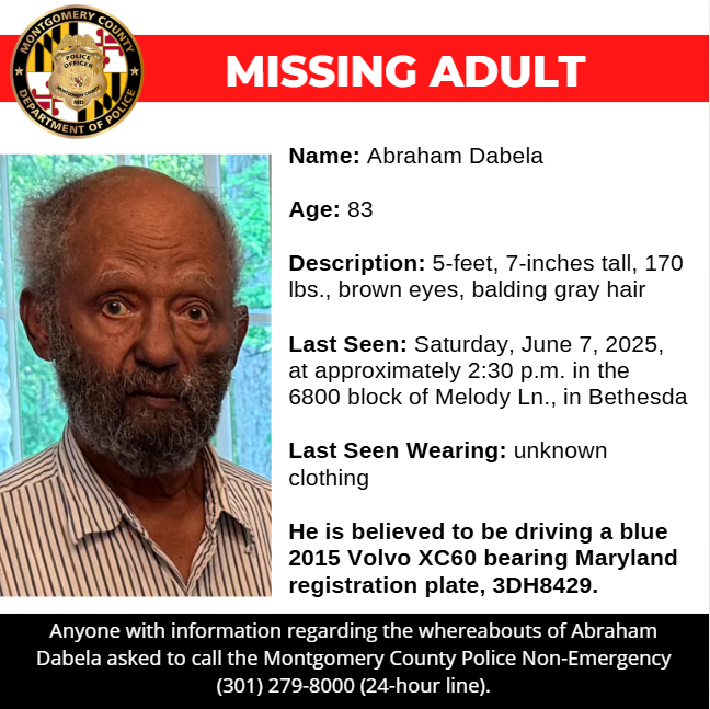 Gaithersburg, MD – Detectives from the Montgomery County Department of Police – 2nd District Investigative Section are asking for the public’s assistance in locating Abraham Dabela, a missing 83-year-old man.