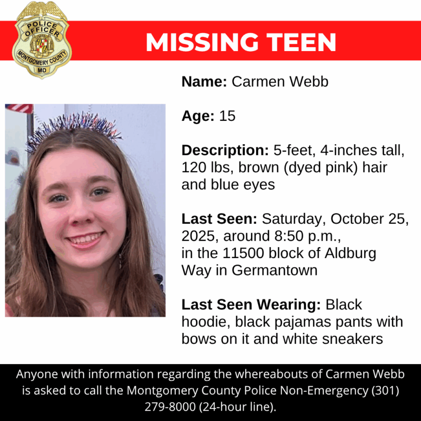Gaithersburg, MD – Detectives from the Montgomery County Department of Police – Special Victims Investigations Division are asking for the public’s assistance in locating Carmen Webb, a missing 15-year-old.Â