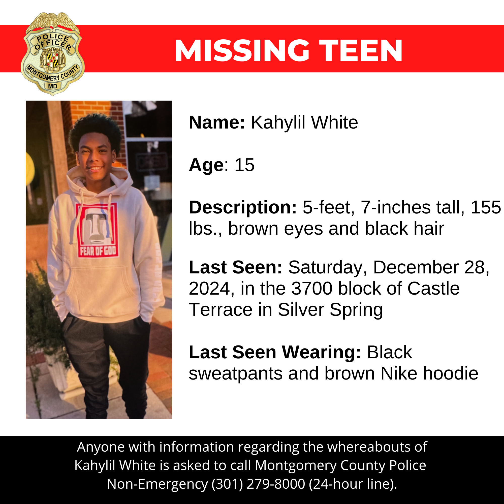 Gaithersburg, MD – Detectives from the Montgomery County Department of Police – Special Victims Investigations Division are asking for the public’s assistance in locating Kayhlil White, a missing 15-year-old from Silver Spring.