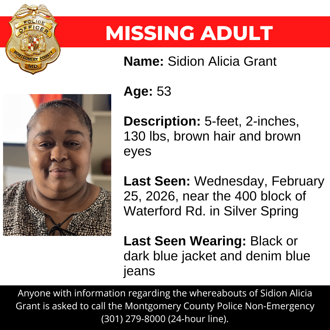 Gaithersburg, MD – Detectives from the Montgomery County Department of Police – 3rd District Investigative Section are asking for the public’s assistance in locating Sidion Alicia Grant, a missing 53-year-old