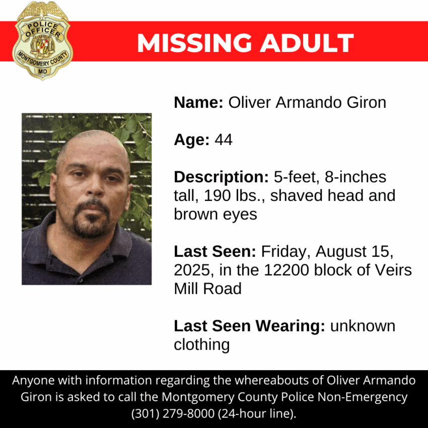 Gaithersburg, MDÂ –Â Detectives from the Montgomery County Department of Police – 4th District Investigative Section are asking for the public’s assistance in locating Oliver Armando Giron, a missing 44-year-old.
