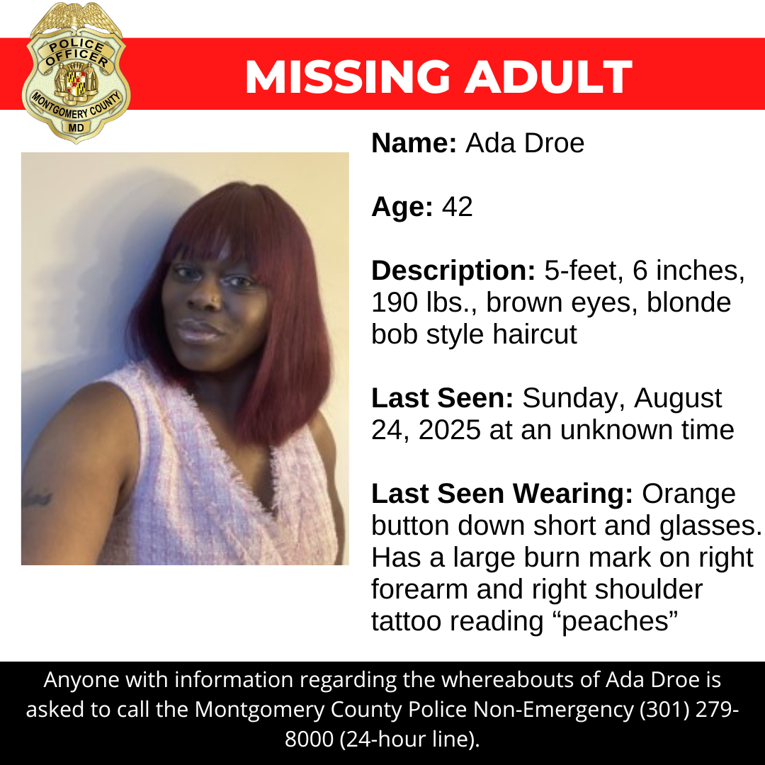 Gaithersburg, MD – Detectives from the Montgomery County Department of Police – 5th District Investigative Section are asking for the public’s assistance in locating Ada Droe, a missing 42-year-old.
