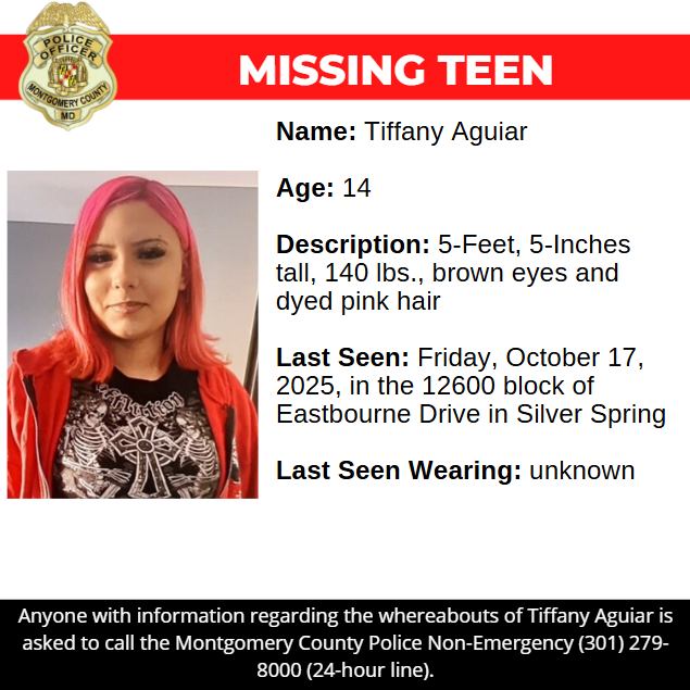 Gaithersburg, MD – Detectives from the Montgomery County Department of Police – Special Victims Investigations Division are asking for the public’s assistance in locating Tiffany Aguiar, a missing 14-year-old.