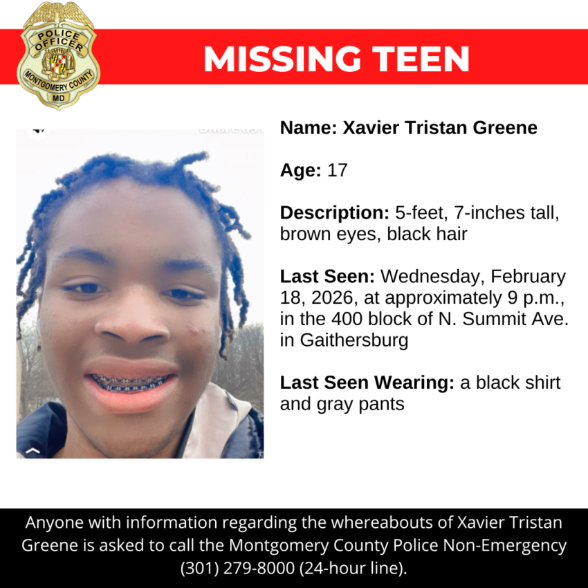 Gaithersburg, MD – Detectives from the Montgomery County Department of Police – Special Victims Investigations Division are asking for the public’s assistance in locating Xavier Tristan Greene, a missing 17-year-old from Gaithersburg.