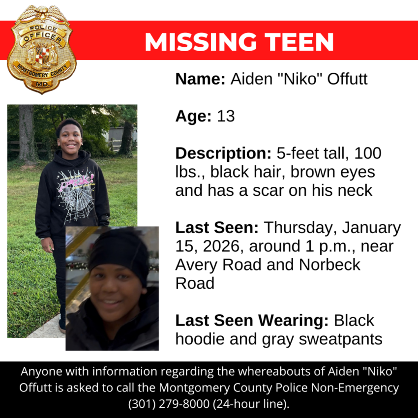Gaithersburg, MD – Detectives from the Montgomery County Department of Police – Special Victims Investigations Division are asking for the public’s assistance in locating Aiden “Niko” Offutt, a missing 13-year-old from Montgomery Village.