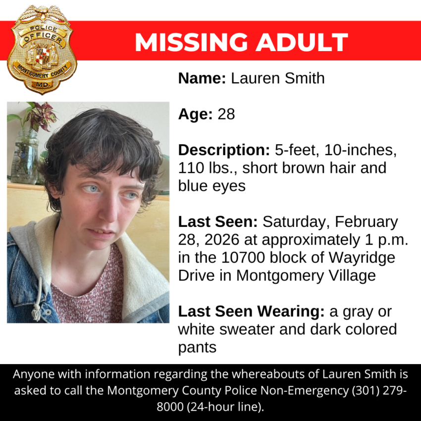Gaithersburg, MD – Detectives from the Montgomery County Department of Police – 6th District Investigative Section are asking for the public’s assistance in locating Lauren Smith, a missing 28-year-old from Montgomery Village.Â