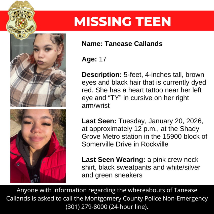 Gaithersburg, MD – Detectives from the Montgomery County Department of Police – Special Victims Investigations Division are asking for the public’s assistance in locating Tanease Callands, a missing 17-year-old.Â