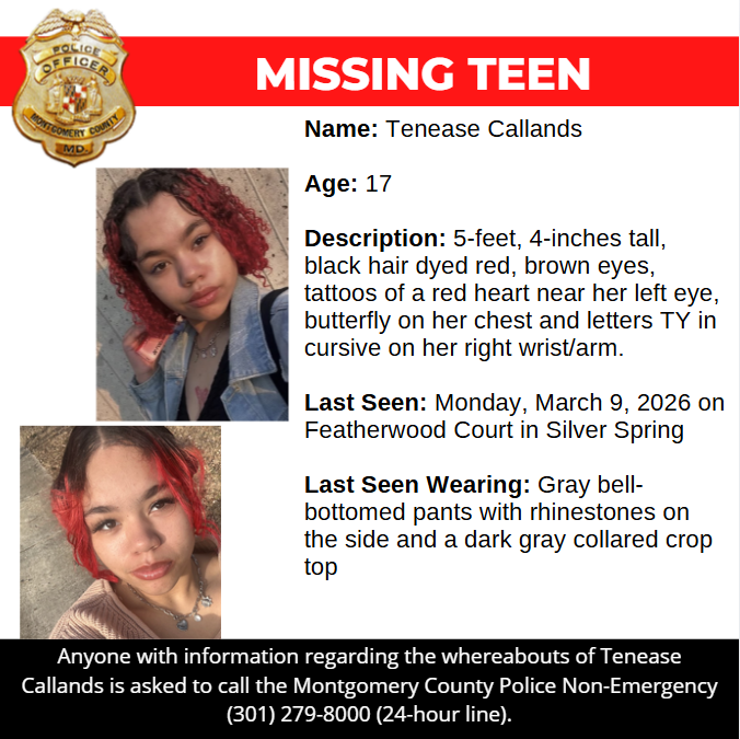 Gaithersburg, MD – Detectives from the Montgomery County Department of Police – Special Victims Investigations Division are asking for the public’s assistance in locating Tenease Callands, a missing 17-year-old.