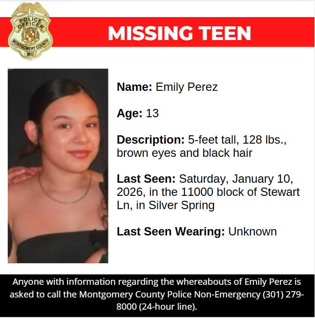 Gaithersburg, MD – Detectives from the Montgomery County Department of Police – Special Victims Investigations Division are asking for the public’s assistance in locating Emily Perez, a missing 13-year-old from Silver Spring.Â