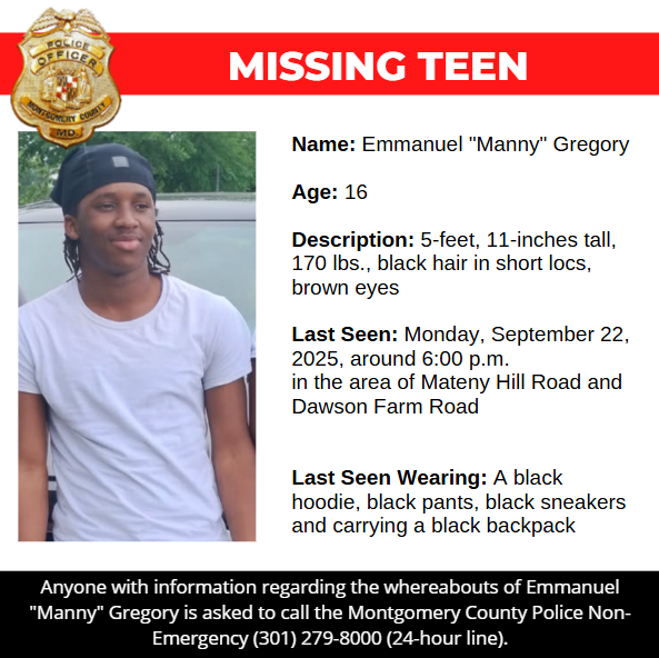 Gaithersburg, MD – Detectives from the Montgomery County Department of Police – Special Victims Investigations Division are asking for the public’s assistance in locating Emmanuel “Manny” Gregory, a missing 16-year-old. Â
