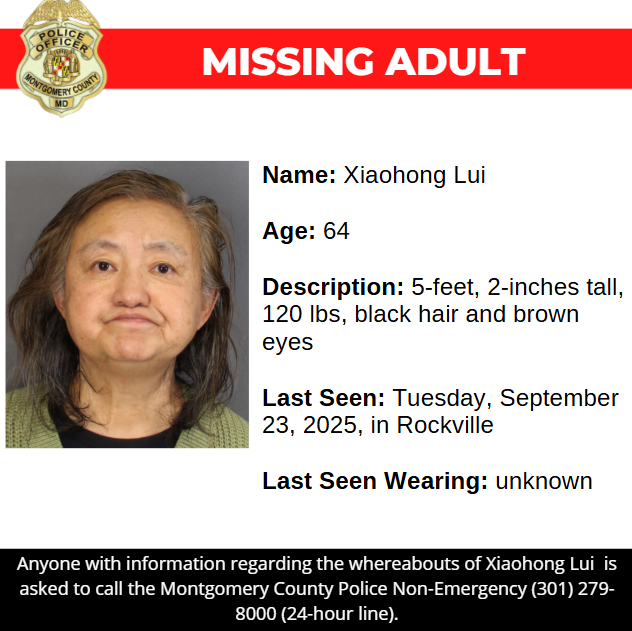 Gaithersburg, MD – Detectives from the Montgomery County Department of Police – Cold Case and Missing Persons Unit are asking for the public’s assistance in locating Xiaohong Lui, a missing 64-year-old from Rockville.