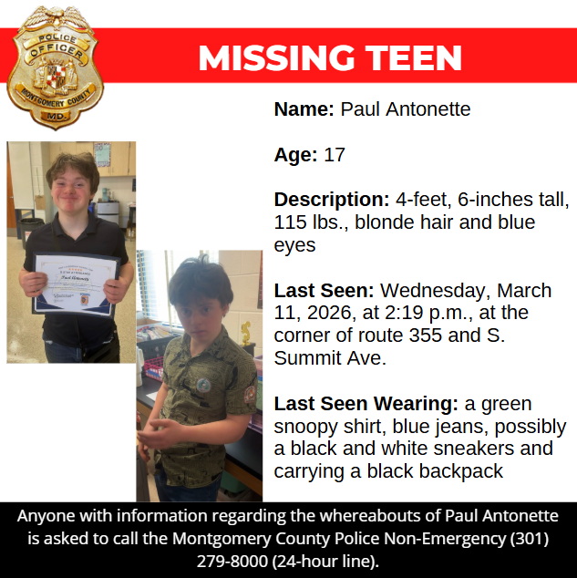 Gaithersburg, MD – Detectives from the Montgomery County Department of Police – Special Victims Investigations Division are asking for the public’s assistance in locating Paul Antonette, a missing 17-year-old from Gaithersburg.