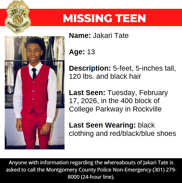 Gaithersburg, MD – Detectives from the Montgomery County Department of Police – Special Victims Investigations Division are asking for the public’s assistance in locating Jakari Tate, a missing 13-year-old from Rockville.Â