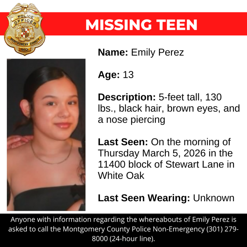 Gaithersburg, MD – Detectives from the Montgomery County Department of Police – Special Victims Investigations Division are asking for the public’s assistance in locating Emily Perez, a missing 13-year-old.