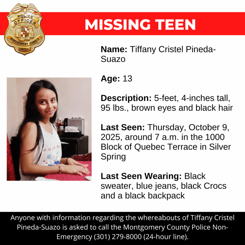 Gaithersburg, MD – Detectives from the Montgomery County Department of Police – Special Victims Investigations Division are asking for the public’s assistance in locating Tiffany Cristel Pineda-Suazo, a missing 13-year-old.