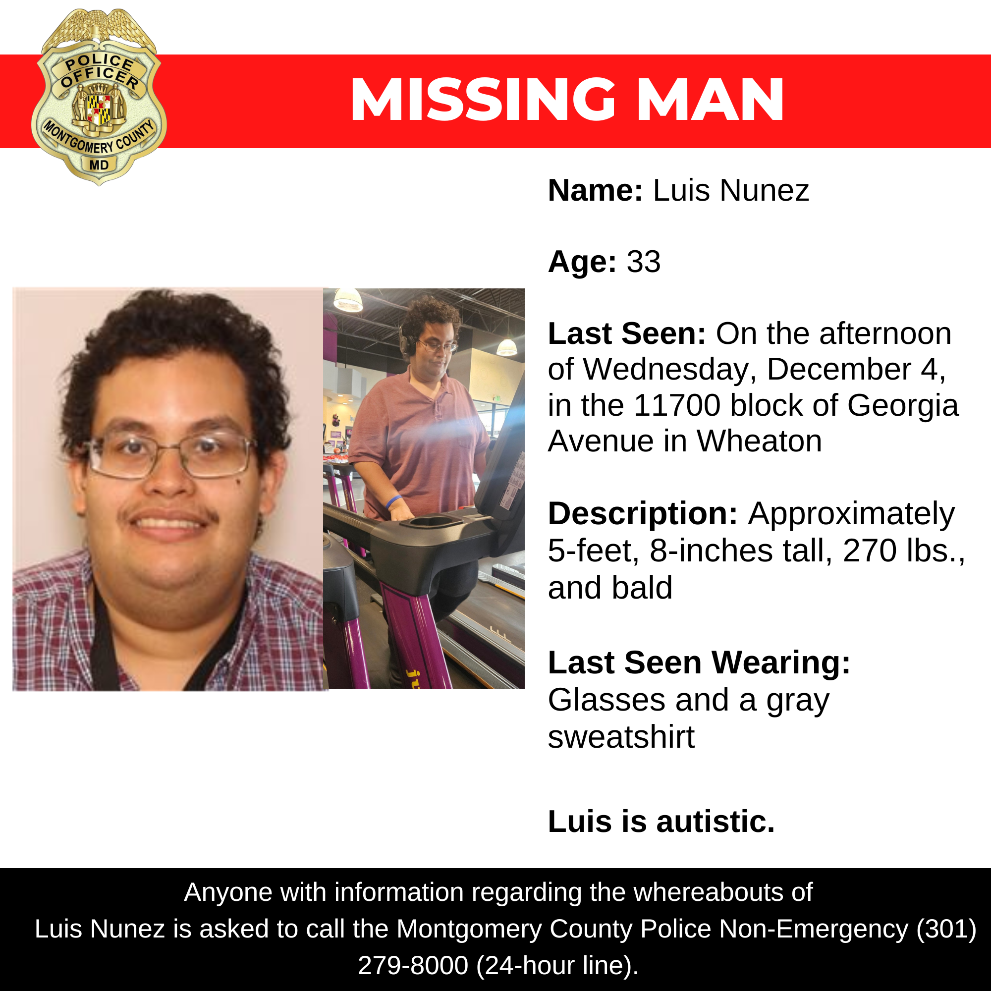 Gaithersburg, MD – Detectives from the Montgomery County Department of Police – 4th District Investigative Section are asking for the public’s assistance in locating Luis Nunez, a missing 33-year-old.