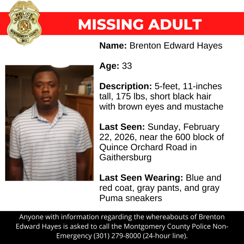 Gaithersburg, MD – Detectives from the Montgomery County Department of Police – 6th District Investigative Section are asking for the public’s assistance in locating Brenton Edward Hayes, a missing 33-year-old.