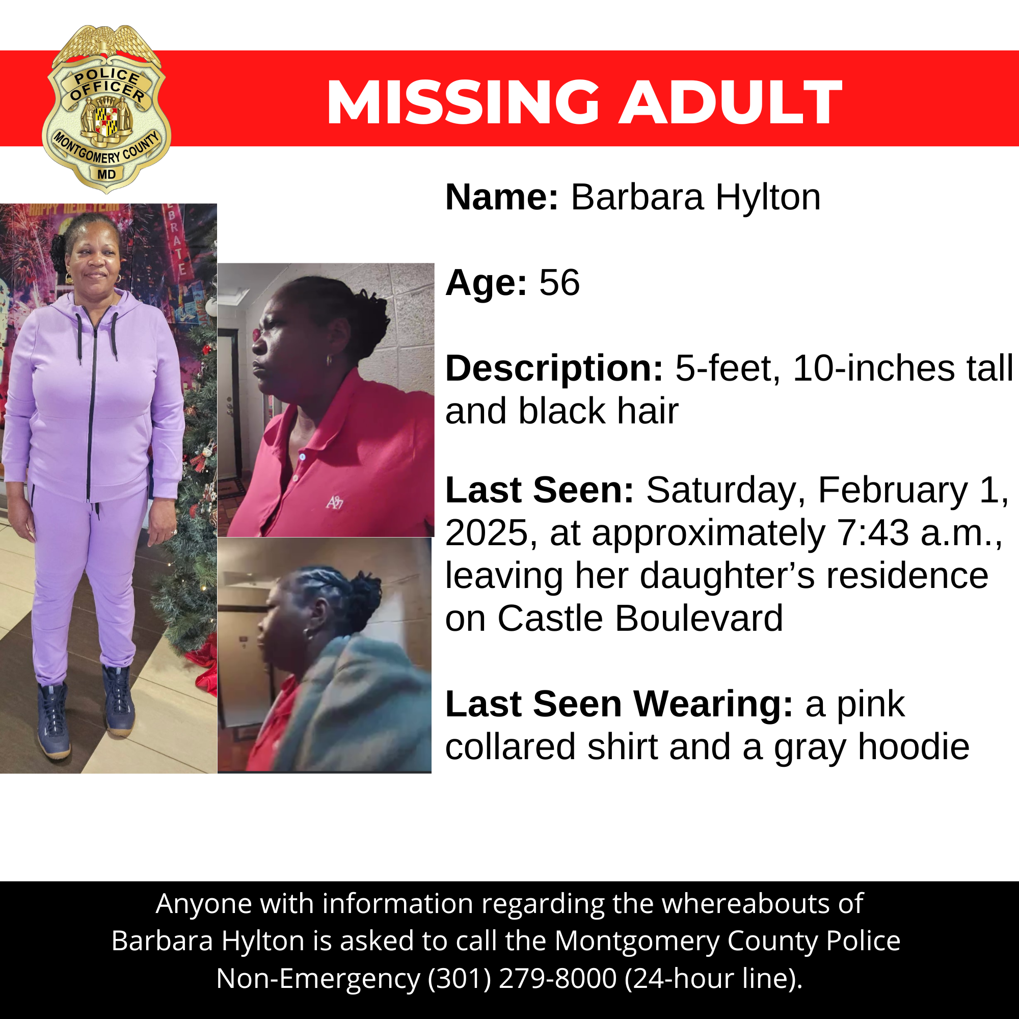 Gaithersburg, MD – Detectives from the Montgomery County Department of Police – 3rd District Investigative Section are asking for the public’s assistance in locating Barbara Hylton, a missing 56-year-old from Silver Spring.