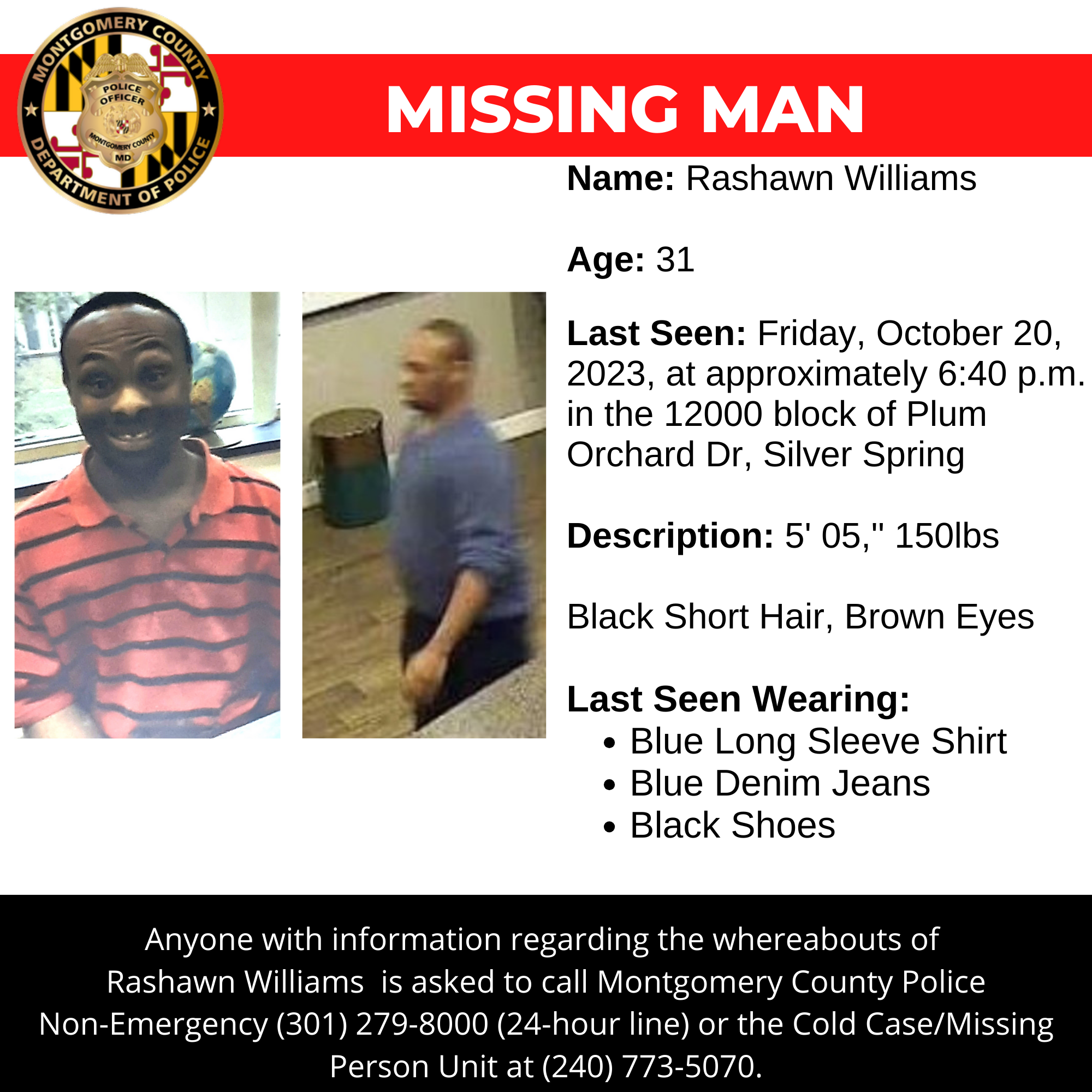 Gaithersburg, MD – The Montgomery County Department of Police – Missing Person/Cold Case Unit continues to ask for the public’s assistance in locating Rashawn Williams, a 31-year-old non-verbal male. Williams was last seen boarding a bus at the intersection of Plum Orchard Drive and Cherry Hill Road in Silver Spring.