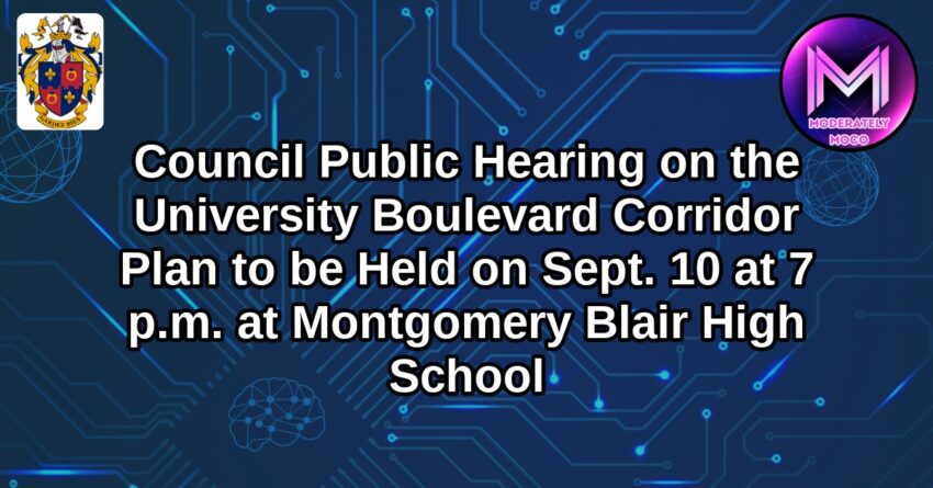 The Montgomery County Council will hold a public hearing on the University Boulevard Corridor Plan on Wednesday, Sept. 10, 2025, at 7 p.m. The Public hearing will take place at the Montgomery Blair High School Auditorium, 51 University Blvd. East, Silver Spring, MD 20901.