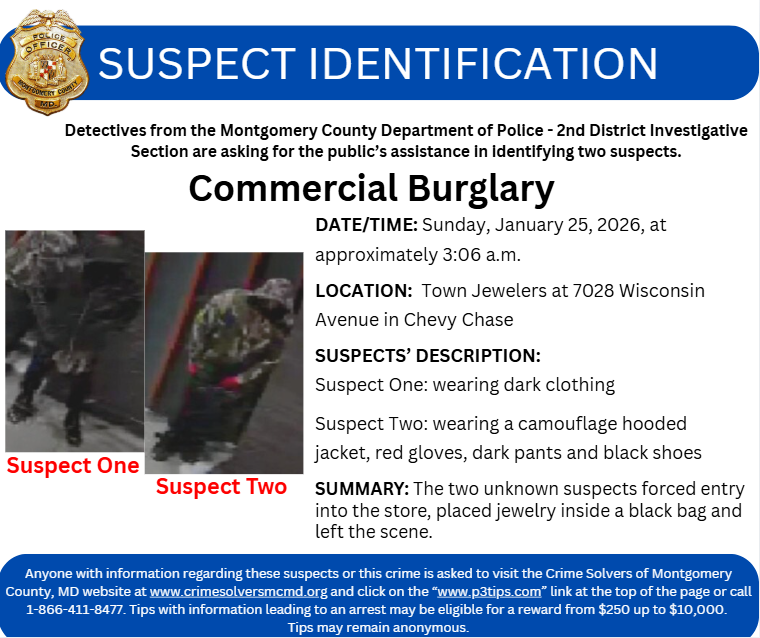 Anyone with information regarding these suspects or this crime is asked to visit the Crime Solvers of Montgomery County, MD website at www.crimesolversmcmd.org and click on the “www.p3tips.com” link at the top of the page or call 1-866-411-8477. Tips with information leading to an arrest may be eligible for a reward from $250 up to $10,000. Tips may remain anonymous.