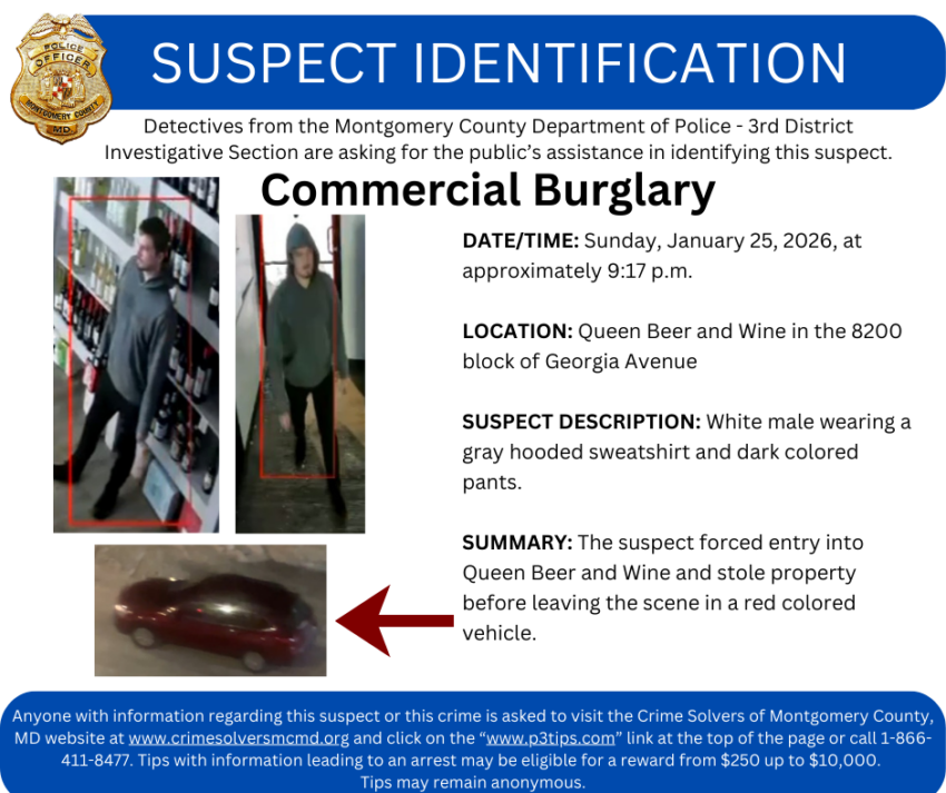 Anyone with information regarding this suspect or this crime is asked to visit the Crime Solvers of Montgomery County, MD website at www.crimesolversmcmd.org and click on the “www.p3tips.com” link at the top of the page or call 1-866-411-8477. Tips with information leading to an arrest may be eligible for a reward from $250 up to $10,000. Tips may remain anonymous.
