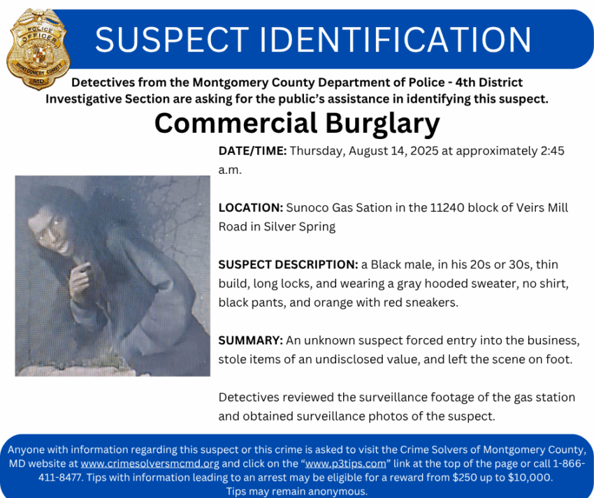 Anyone with information regarding this suspect or this crime is asked to visit the Crime Solvers of Montgomery County, MD website at www.crimesolversmcmd.org and click on the “www.p3tips.com” link at the top of the page or call 1-866-411-8477. Tips with information leading to an arrest may be eligible for a reward from $250 up to $10,000. Tips may remain anonymous.