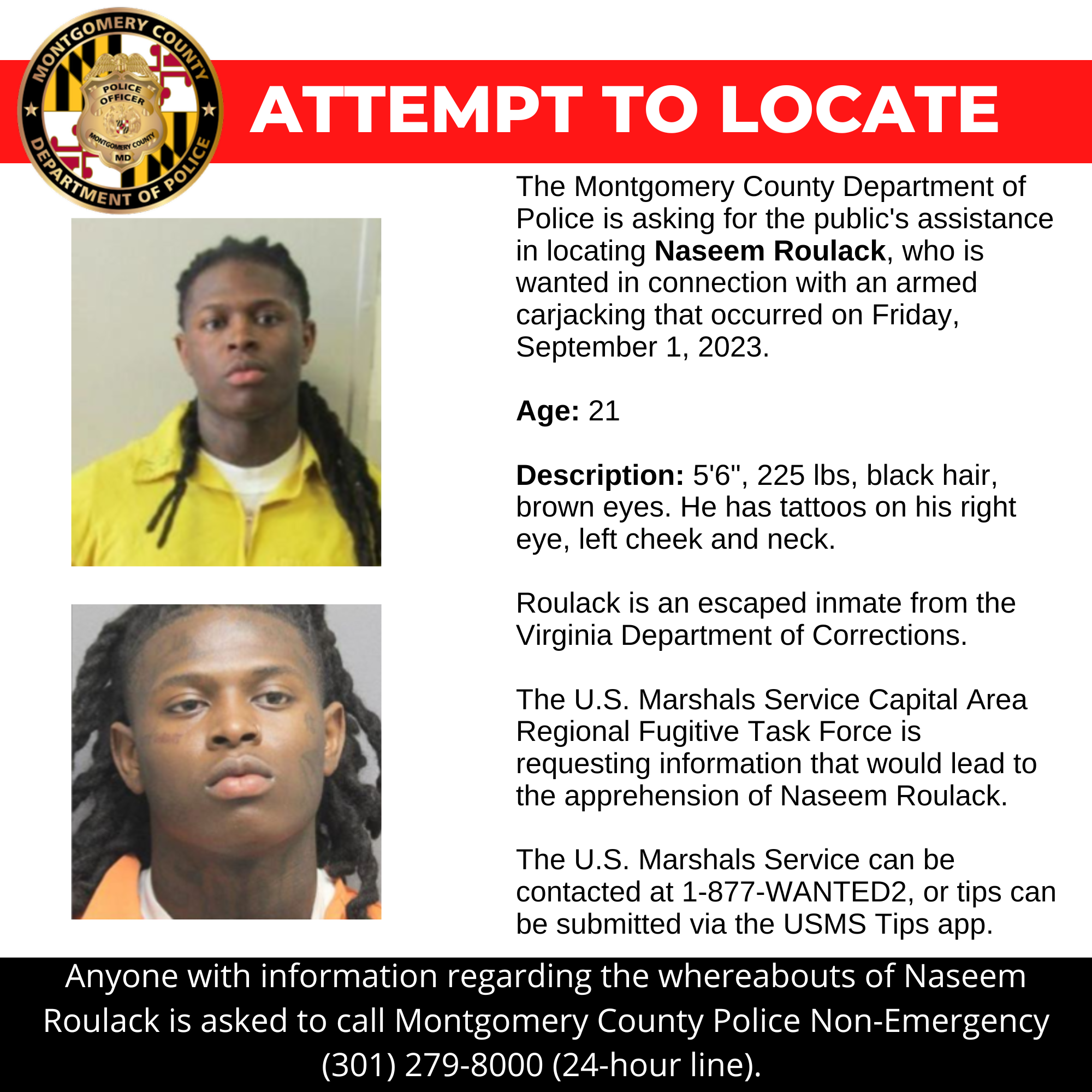 Gaithersburg, MD – Detectives from the Montgomery County Department of Police – Major Crimes Division are asking for the public’s assistance in locating 21-year-old Naseem Roulack, who is wanted in connection with an armed carjacking that occurred on Friday, September 1, 2023.