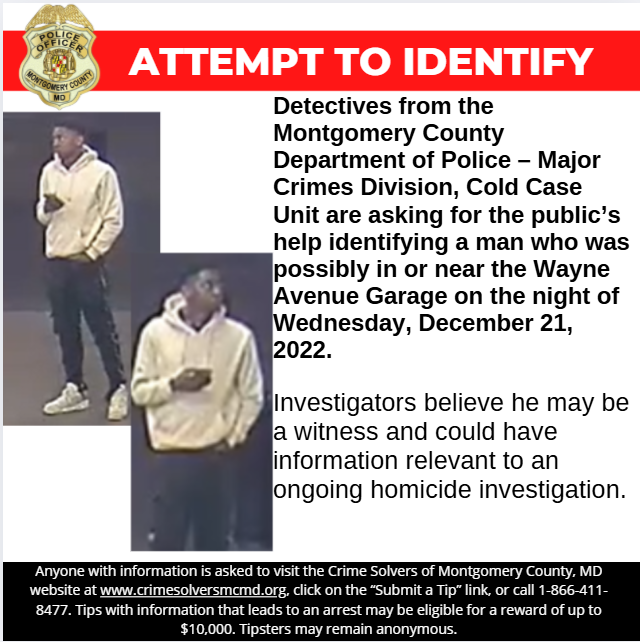 Gaithersburg, MD – Detectives from the Montgomery County Department of Police – Major Crimes Division, Cold Case Unit are asking for the public’s help identifying a man who was possibly in or near the Wayne Avenue Garage on the night of Wednesday, December 21, 2022.