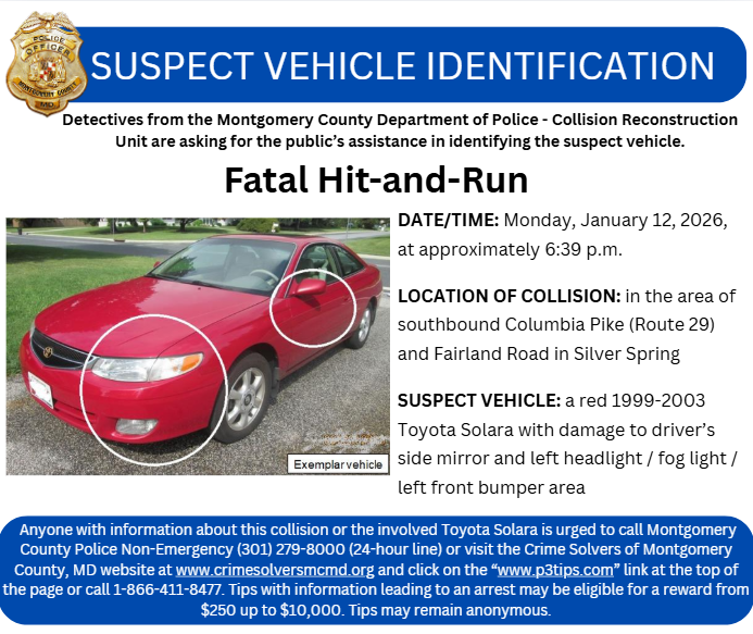 Anyone with information about this collision or the involved Toyota Solara is urged to call Montgomery County Police Non-Emergency (301) 279-8000 (24-hour line) or visit the Crime Solvers of Montgomery County, MD website at www.crimesolversmcmd.org and click on the “www.p3tips.com” link at the top of the page or call 1-866-411-8477. Tips with information leading to an arrest may be eligible for a reward from $250 up to $10,000. Tips may remain anonymous.
