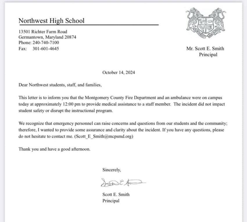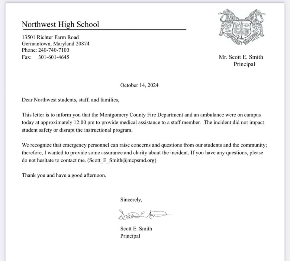 An incident occurred today (Monday 10/14/24) at Northwest High School in Montgomery County that is coming under heavy scrutiny after letter to parents does not seem to match up with local news reporting.