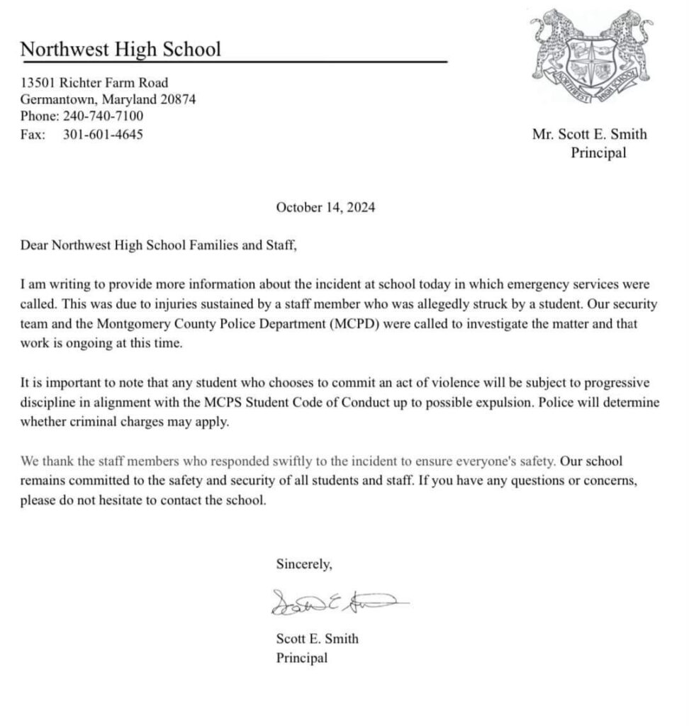 “I am writing to provide more information about the incident at school today in which emergency services were called. This was due to injuries sustained by a staff member who was allegedly struck by a student. Our security team and the Montgomery County Police Department (MCPD) were called to investigate the matter and that work is ongoing at this time.