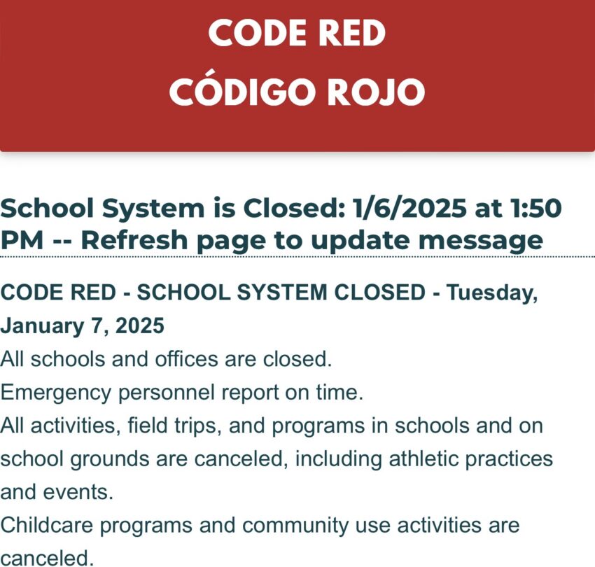 “CODE RED – SCHOOL SYSTEM CLOSED – Tuesday, January 7, 2025