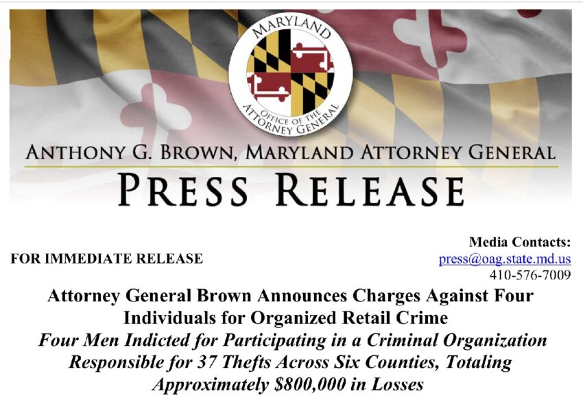 BALTIMORE, MD (November 25, 2024) – Attorney General Anthony G. Brown today announced the indictments of four individuals for their roles in a criminal organization responsible for approximately $800,000 in retail burglaries and thefts across at least six jurisdictions in Maryland. The investigation was led by the Gaithersburg and Montgomery County Police Departments.