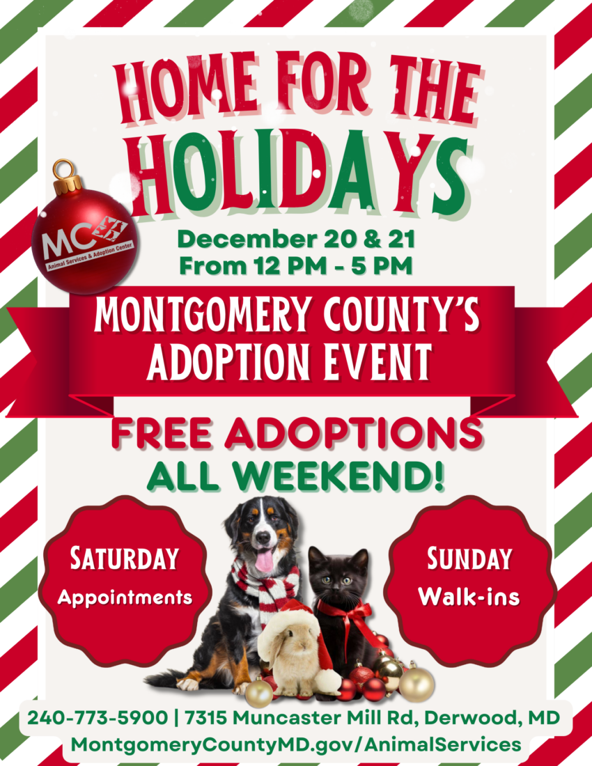 To help reduce wait times during the adoption event, Montgomery County Animal Services and Adoption Center will use an appointment system on Saturday, Dec. 20. Walk-ins will be welcome on Sunday, Dec. 21, based on counselor availability and as space allows. MSASAC is open from noon to 5 p.m. both days. The Center is located at 7315 Muncaster Mill Road in Derwood.