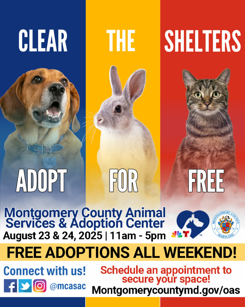 Montgomery County Animal Services and Adoption Center (MCASAC) will waive pet adoption fees Saturday and Sunday, Aug. 23-24, as part of NBCUniversal Local’s 2025 “Clear the Shelters” campaign. Last year, 145 pets found homes during the event.