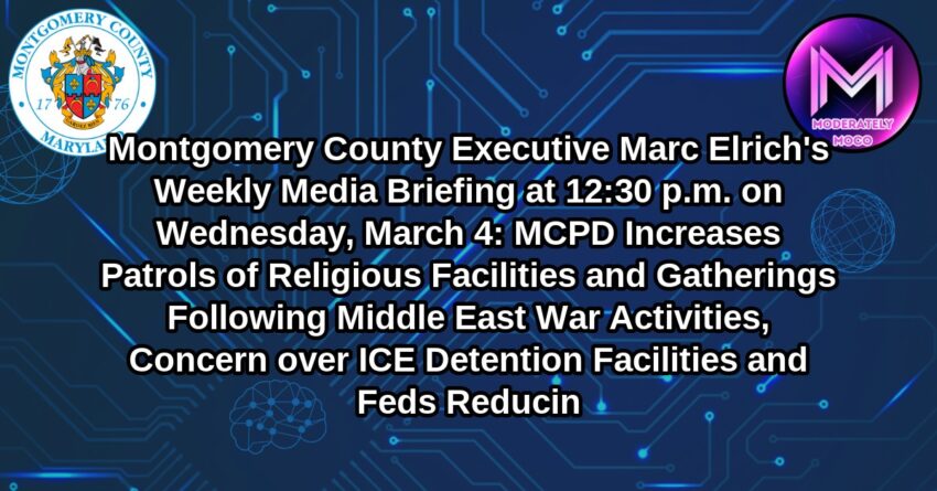 The County Executive will talk about increased MCPD patrols of religious facilities and gatherings in the wake of war activities in the Middle East, as well as efforts to prevent ICE detention facilities from being opened in Montgomery County. He will also discuss troubling updates regarding federal budget guidance on research grants from the National Institutes of Health.