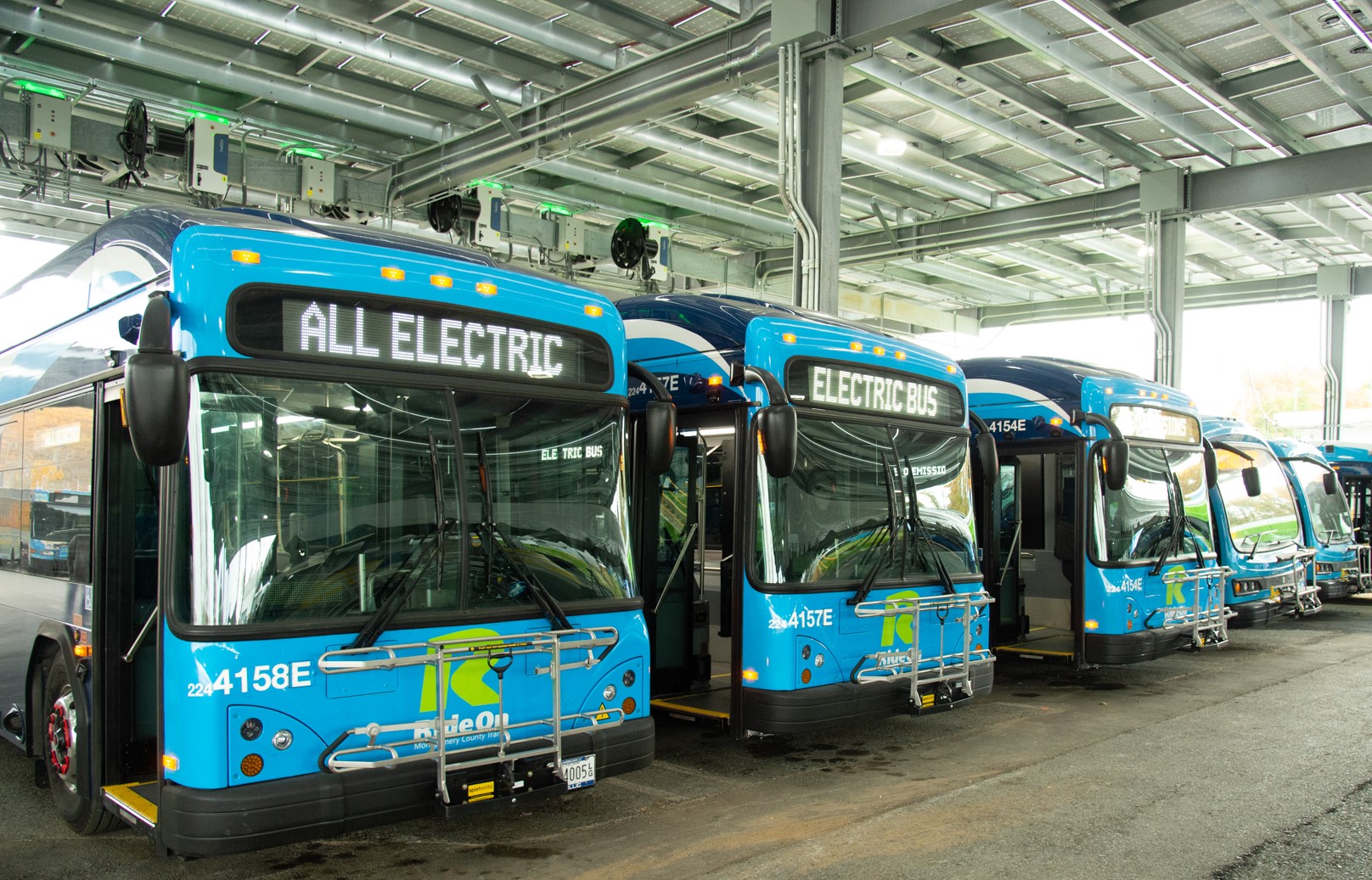 The County is developing green charging infrastructure to support these buses. In October 2022, the County unveiled its first solar-powered microgrid for bus charging at the Brookville Bus Depot in Silver Spring. The facility is able to charge up to 70 buses with solar power. At the time of its unveiling, Brookville was the nation’s largest solar charging facility for public transportation.