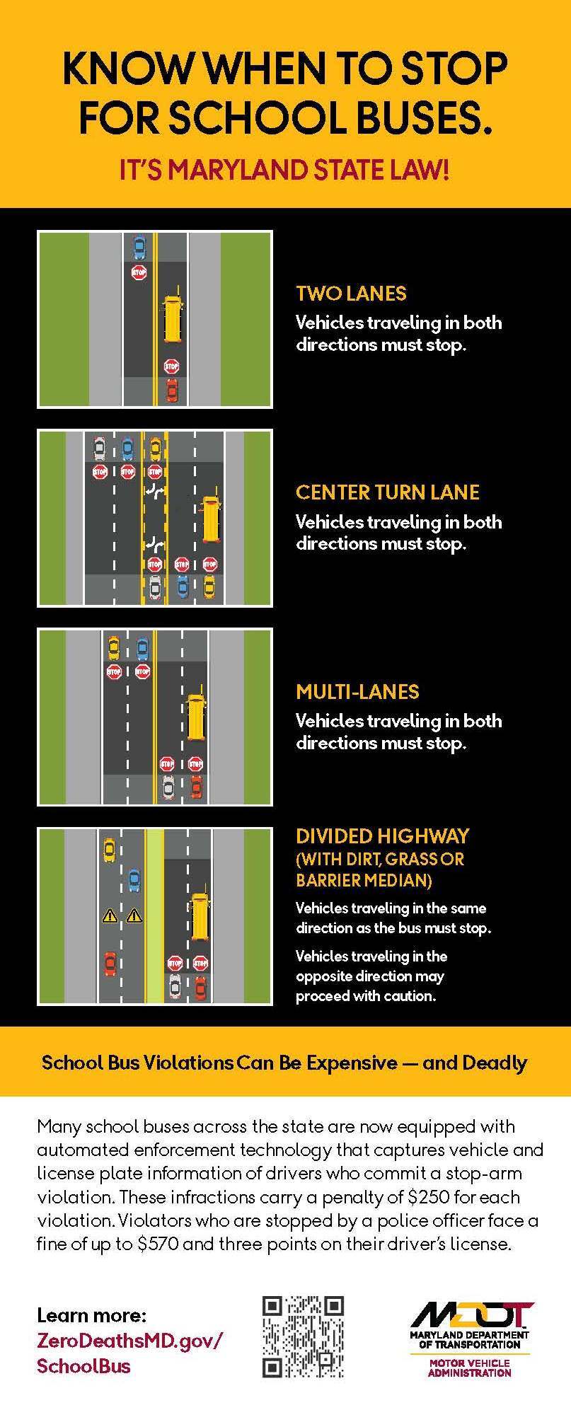 Drivers in Maryland must stop at least 20 feet from a school bus when the stop arm is extended, and the red lights are flashing. Drivers may not pass the bus from any direction until the stop signals are off and the bus is moving again. Motorists are not required to stop if the road is separated by a physical median such as dirt, grass or a barrier. Infractions captured by school bus cameras carry a penalty of $250 for each violation. Violators who are stopped by a police officer face a fine of up to $570 and three points on their driver’s license.