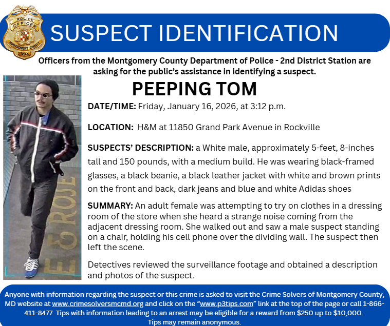 Anyone with information regarding the suspect or this crime is asked to visit the Crime Solvers of Montgomery County, MD website at www.crimesolversmcmd.org and click on the “www.p3tips.com” link at the top of the page or call 1-866-411-8477. A reward of up to $10,000 is being offered for information that leads to the arrest of the suspects. Tips may remain anonymous.