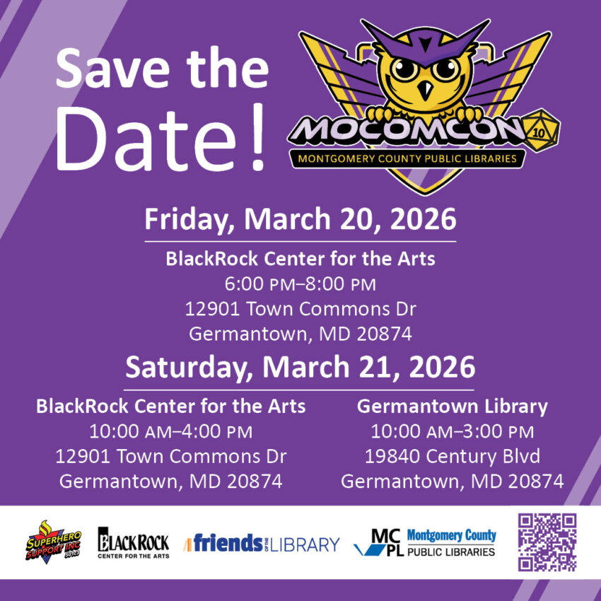 Montgomery County Public Libraries (MCPL) will host its 10th annual MoComCon on Friday and Saturday, March 20–21, with events at Germantown Library and BlackRock Center for the Arts in Germantown. MoComCon 2026 is a free, family-friendly celebration of comics, storytelling, visual art, and community engagement.