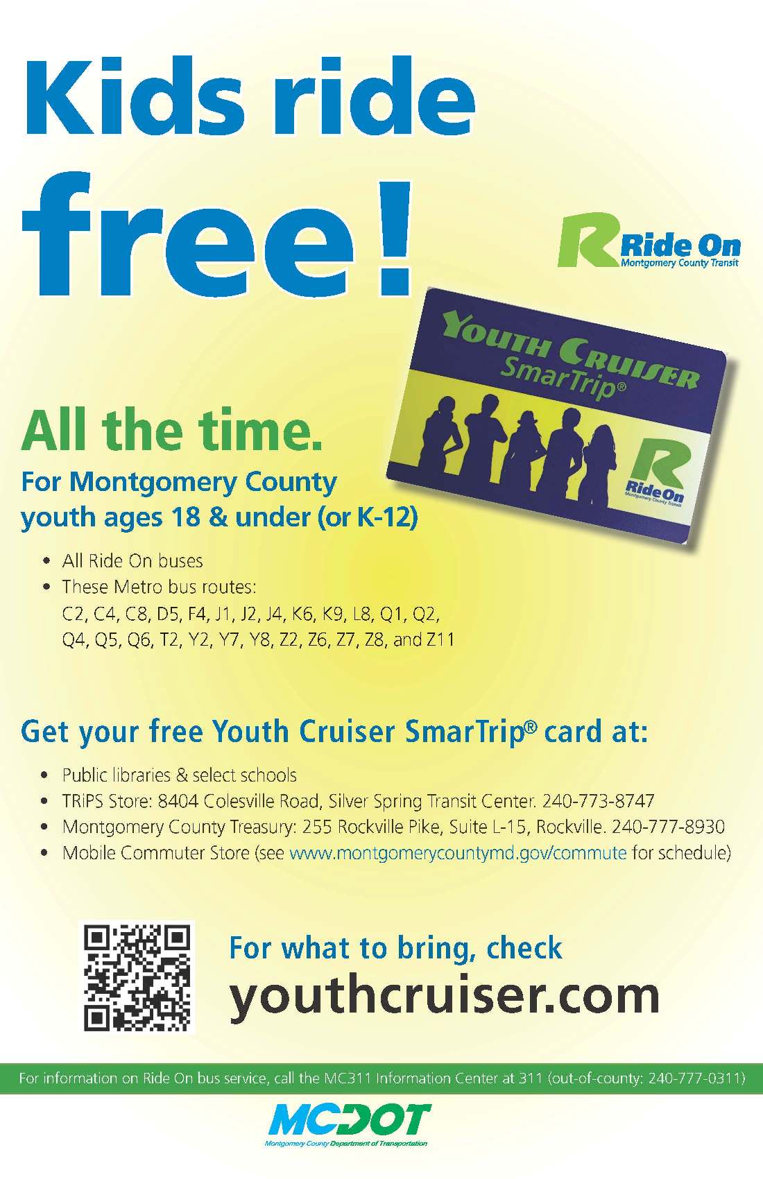 The Youth Cruiser SmarTrip® card is for Montgomery County residents ages 5 to 18 (older if still in high school) that provides free rides on all Montgomery County Ride On buses , including Ride On extRa , Ride On Flex and Flash . The card also will waive fares on most Metro buses operating in the County. Value also can be added to the card for service on Metrorail and Metrobuses outside the County.