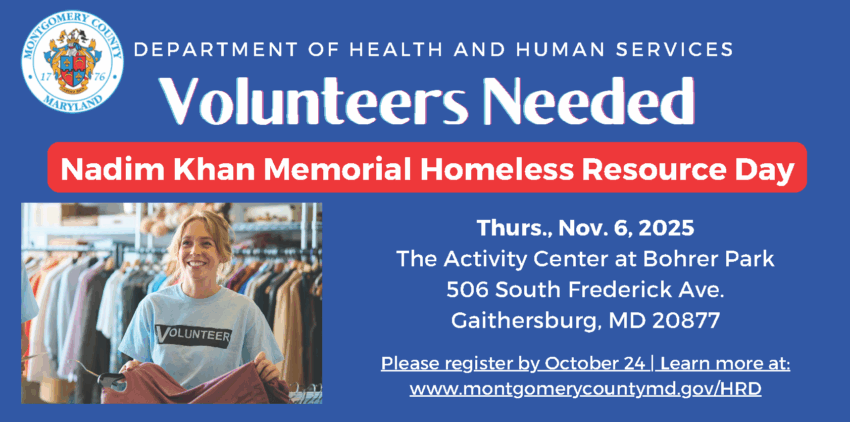 The Montgomery County Department of Health and Human Services (DHHS) will host the annual Nadim Khan Memorial Homeless Resource Day on Thursday, Nov. 6, from 10 a.m.–3 p.m., at the Activity Center at Bohrer Park, located at 506 South Frederick Ave. in Gaithersburg. The event is a one-day, one-stop opportunity for individuals and families experiencing homelessness, or those at risk of becoming homeless, to access a broad array of critical services in a single location.